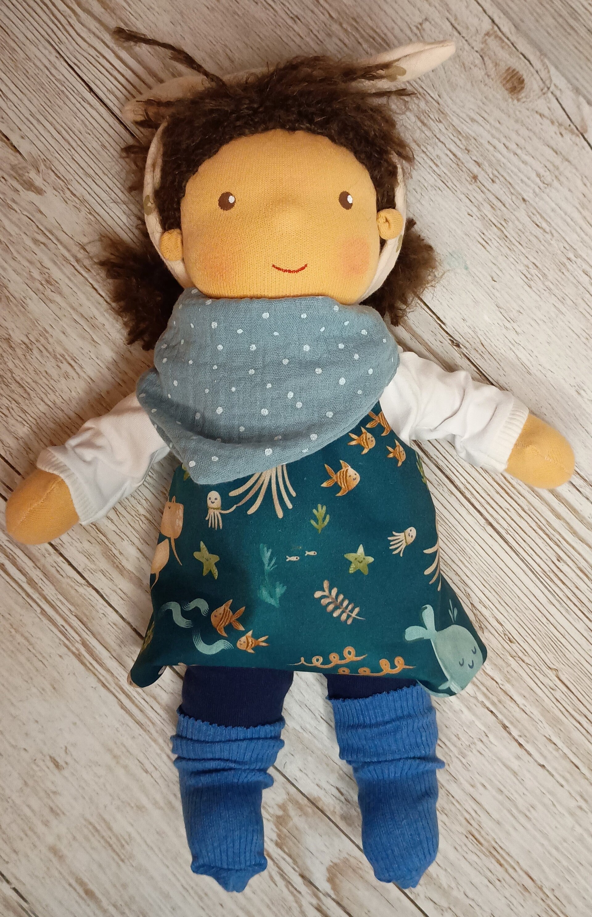 Die Stoffpuppe Pia ist ein handgefertigtes Unikat und wartet darauf, Teil einer neuen Familie zu werden.