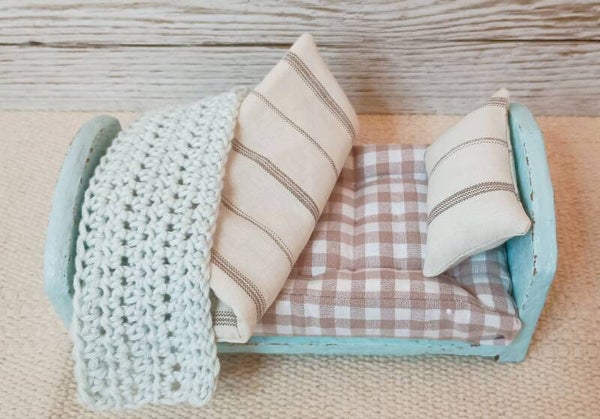 Bett mit Matratze, Kopfkissen, Bettdecke und gehäkeltem Überwurf